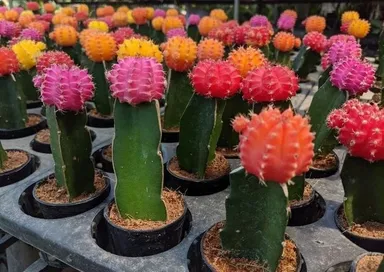 Na rozdiel od väčšiny kaktusov so zeleným alebo hnedastým stonkom, ktoré obsahujú chlorofyl, mesačný kaktus má farebný stonok a nedokáže rásť samostatne. Preto sa vrúbľuje na zelený kaktus – to, čo vidíte na fotografii, sú v skutočnosti dve rastliny v jednej.